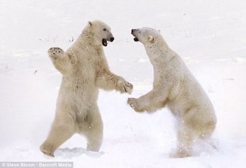 在布鲁姆拍摄的这组令人难以置信的“矛盾冲突”系列图片中,两只秃鹰为了领空,在阿拉斯加州上空展开激战;博茨瓦纳的大象用身体冲撞对方,周围扬尘满天飞;两只北极熊为了统治权相互扭打在一起。