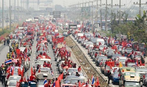 美联社一位记者在曼谷以北旺内的一条高速路上看到,一支长7公里的“红衫军”队伍正接受检查,导致这条路出现长达50公里的交通堵塞。