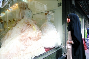 3月14日,一名伊朗妇女看着商店橱窗内展示的婚纱。伊朗政府日前推出在线婚前教育课程。